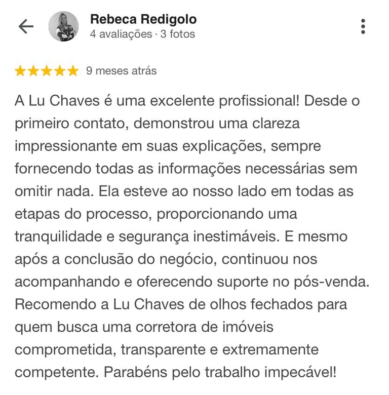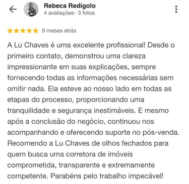 Me chamo Luciana Chaves mas pode me chamar de Lu (@luchavesbrokersp) Cristã de 39 anos, casada, mãe de 2 filhas e uma pet. Perdi 25 mil reais na compra de um terreno (meu primeiro imóvel). Essa experiência me marcou profundamente.
